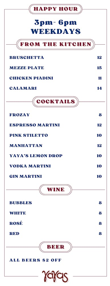 grilled pita, YaYa’s famous hummus, chili oil, kalamata olives, feta